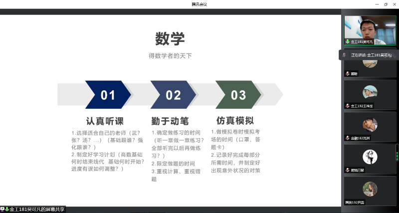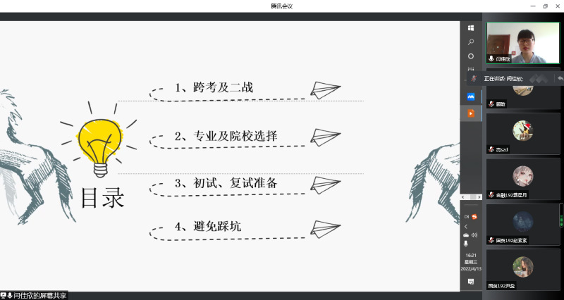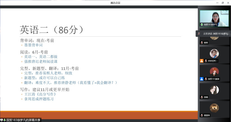 为进一步帮助学生明确考研目标,掌握了解更多考研信息,我院于4月7日至15日分别举办了五场线上考研经验分享交流会。交流会由辅导员顾晗老师主持。