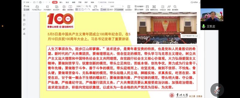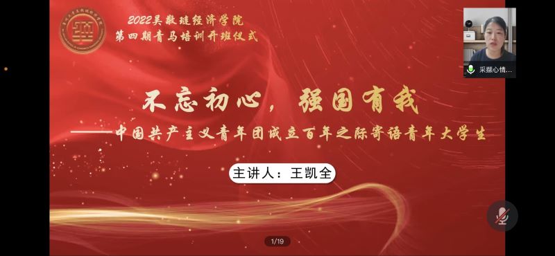 5月11日晚,为庆祝中国共产主义青年团成立一百周年,响应习近平总书记对青年一代的号召,提高青年的思想觉悟,我院采用线上会议形式举行第四期青马培训开班仪式,本次活动邀请校关工委副主任王凯全作主讲人,院党委副书记王彩芳主持会议。