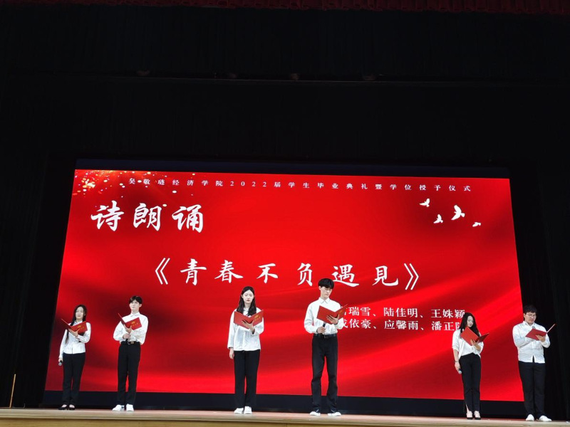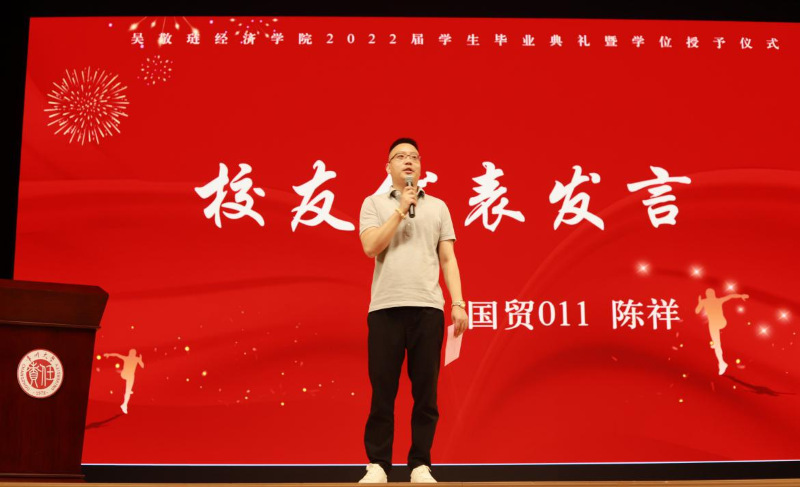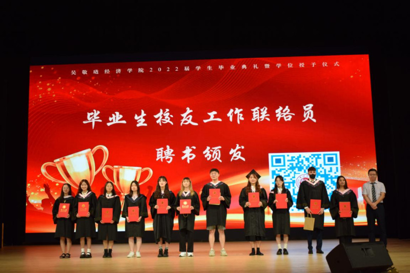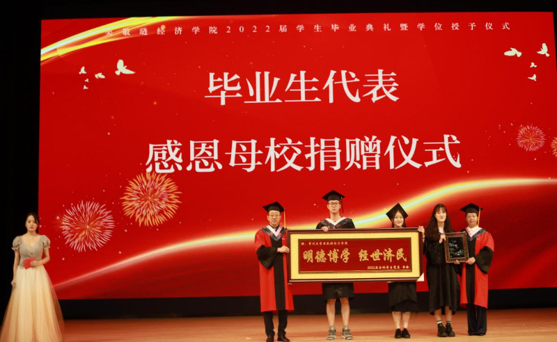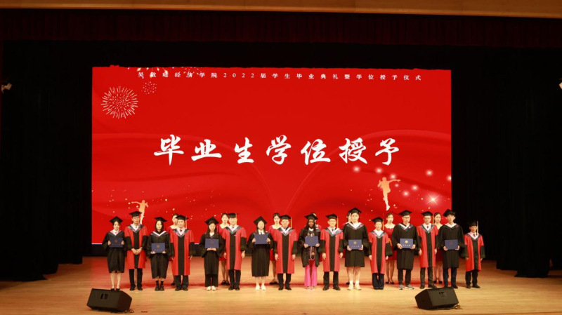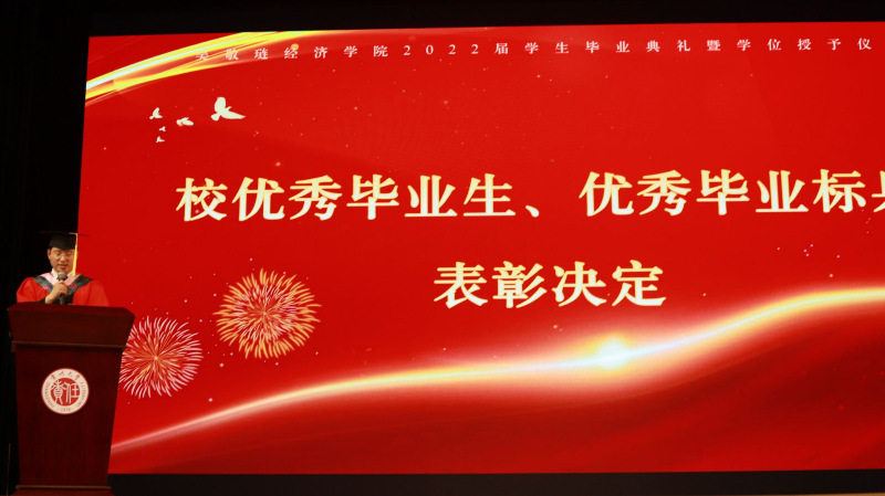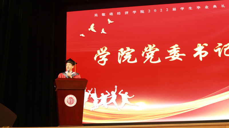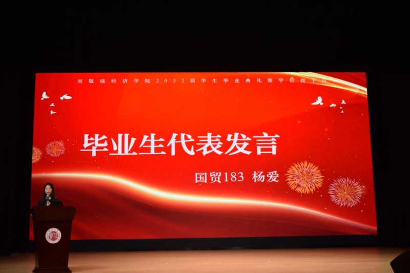 典礼开始前,汇塑集团和国联证券的企业祝福展播、学院舞龙队生动的舞龙表演,以及同学们的歌曲串烧和走秀点燃全场。随着振奋人心的国歌声唱响,2022届毕业典礼正式开始。ACG盒子 院长姜国刚做毕业致辞,提出学生们在以后的工作中要做到“三心二意”,其中三心是指责任心,进取心和感恩心,二意是心怀诚意,方能如意。其次由国贸系主任管志杰,金融学系主任曹启龙,金融工程系主任姚惠泽,常州汇塑勤业进出口有限公司总经理陈祥为考研学生颁发考研表彰。ACG盒子 副院长任保全宣读校优秀毕业生、优秀毕业生标兵表彰决定。典礼进行到中场,由宫瑞雪,陆佳明等同学带来深情的诗朗诵《青春,不负遇见》。典礼迎来最重要的拨穗环节,由姜鸿、姜国刚等八位老师为毕业生拨穗正冠并与毕业生合影留念。紧接着毕业生代表国贸183杨爱等同学发表毕业感言并举行毕业生代表感恩母校捐赠仪式。随后,校友代表陈祥发言、杨帅老师为毕业生颁发校友联络员聘书,鼓励毕业生保持与母校的联系。学院党委书记姜鸿向毕业学生们做毕业致辞,激励同学们学会感恩,养成健康心理,学会积极看待问题。最后,典礼以学院合唱团的《用尽我的一切奔向你》圆满收尾。