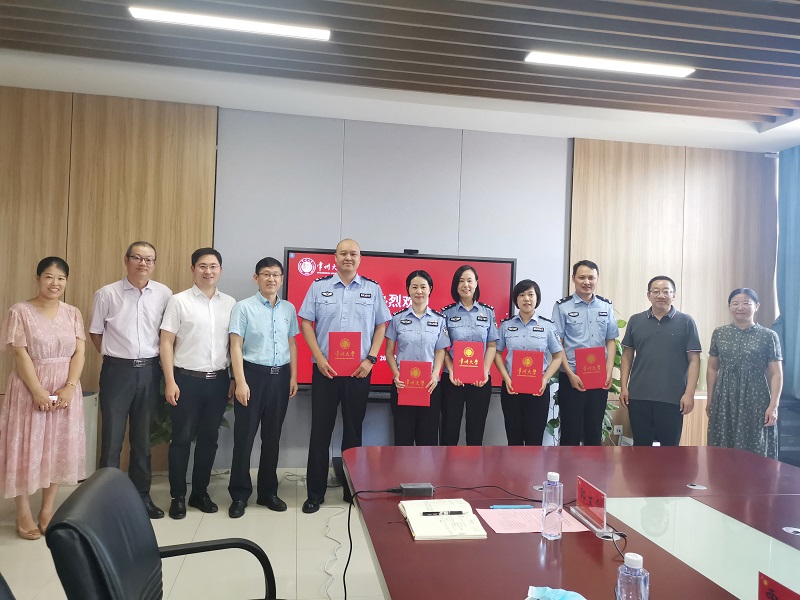 学院院长姜国刚为常州市公安局相关人员颁发常州市啄木鸟反金融欺诈咨询服务中心指导老师聘书。双方还就校园安全保卫、意识形态、成立校园反诈中心等工作进行深入研讨。
