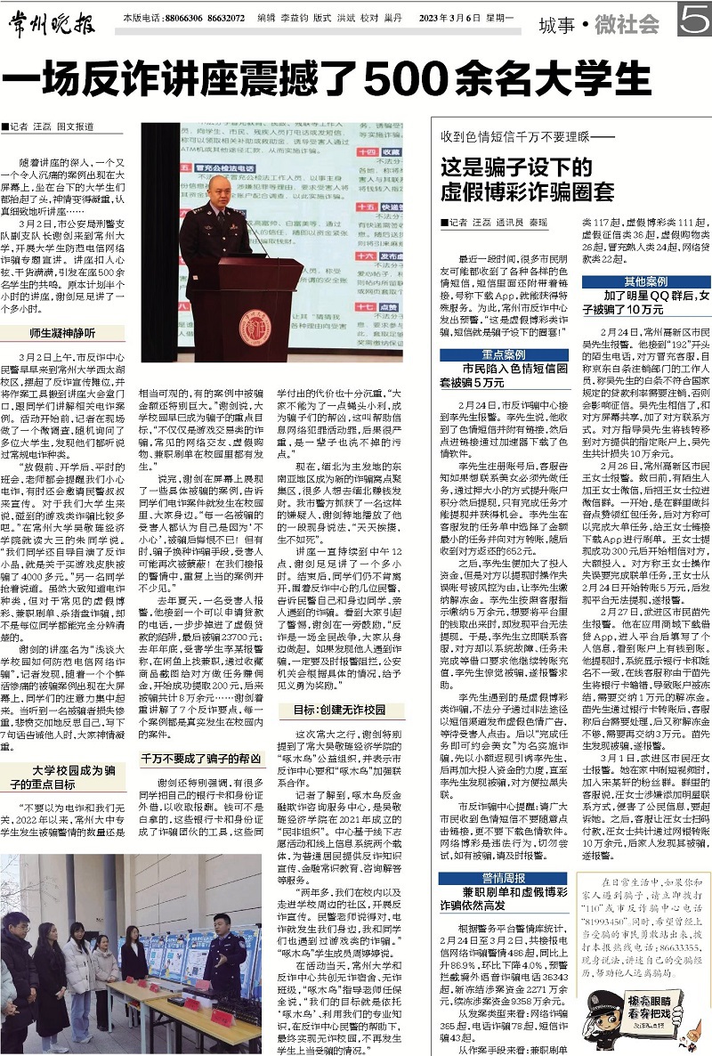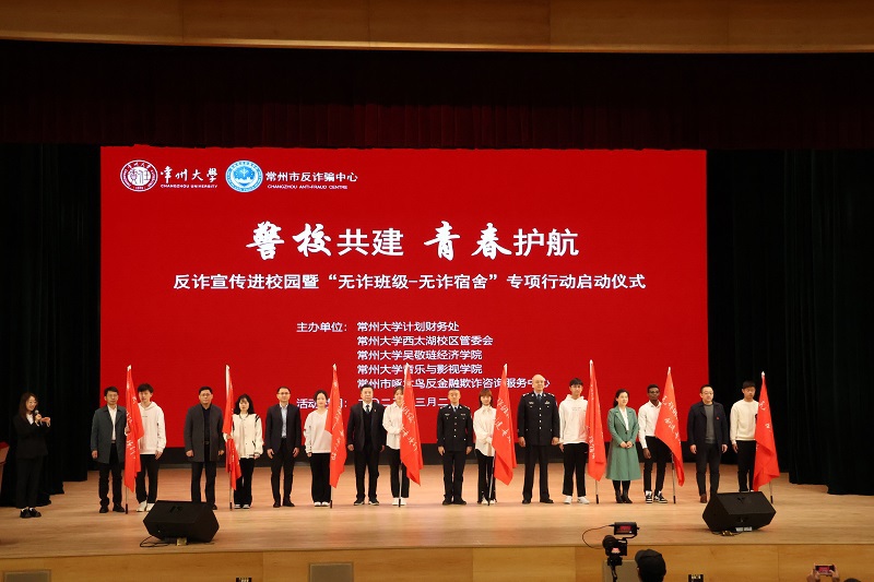 3月2日上午,西太湖校区反诈宣传进校园暨“无诈班级-无诈宿舍”专项行动启动仪式在西太湖立艺楼礼堂举行,常州市公安局、人保财险常州分公司和中国移动常州分公司等负责人受邀参加活动,学校财务处、校区管委会和相关学院出席活动。