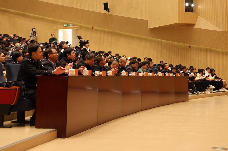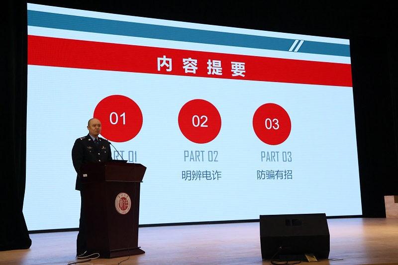 警校共建,青春护航——反诈宣传进校园暨“无诈班级-无诈宿舍”专项行动启动仪式将活动推向又一个高潮,常州市公安局、学校职能部门老师上台为学生授旗,ACG盒子 、音乐与影视学院的中外学生代表上台接受授旗,这标志着建设“无诈校园”成为每一位常大学子的责任。常州市公安刑警支队副支队长谢剑作了“浅谈大学校园如何防范电信网络诈骗”主题报告,他用简洁生动的语言从电诈现状、明辨电诈、防骗有招等三个方面,详细讲解了电信网络诈骗形式、如何辨别电信网络诈骗、具体防骗招数,强调大学生应该提高防范电信网络诈骗的意识和能力,同时倡导大家关注“平安常州”公众号,切实守护好自己的“钱袋子”。