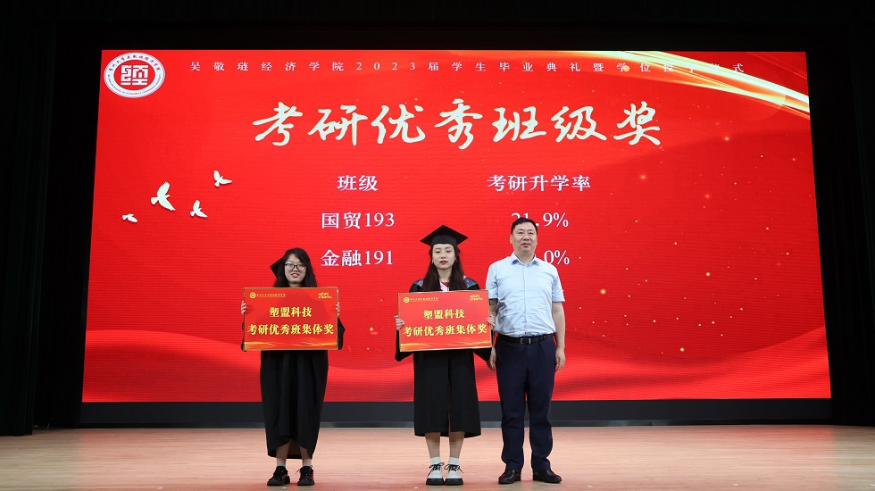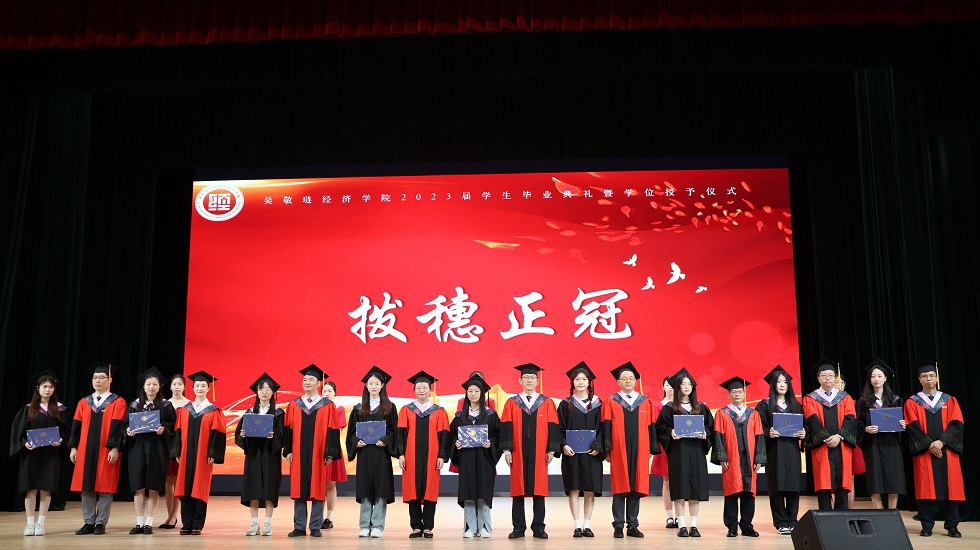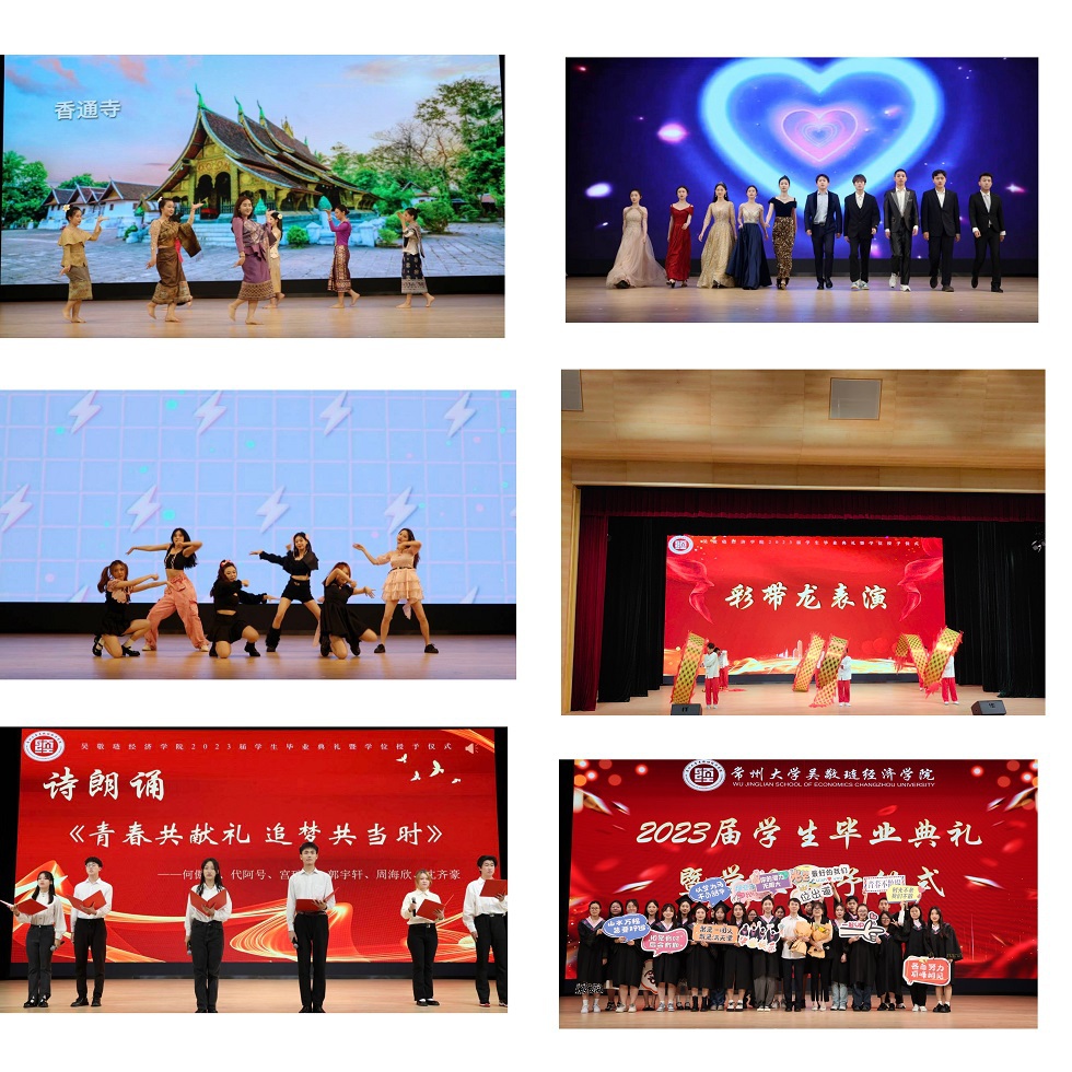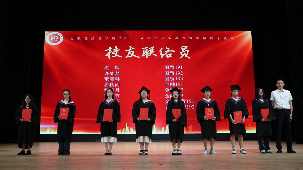 接下来,龚东卫为考研先进个人、考研优秀班集体颁发表彰。院长助理、金融系主任曹启龙宣读校优秀毕业生表彰决定。随着动感舞蹈的律动,朗朗诵读的萦绕,2023届毕业生学位授予仪式开始,由姜鸿、季小立等十位老师为2023届毕业生拨穗正冠。随后,金融191张晓旭和国贸194 VIRIRI REGINALD TINOTENDA作为优秀毕业生代表发言,他们感恩母校与老师的悉心培育,勉励全体毕业生坚定信念、追逐梦想,不负青春年华。紧接着,毕业生捐赠仪式及学院毕业礼品发放仪式开始,感恩母校情、莘莘学子心在这一刻彰显。邓伟为毕业生颁发校友联络员聘书,希望校友联络人架起母校与毕业生间坚固的桥梁。龙腾虎跃,舞姿铿锵,留学生舞龙队带来的表演振奋全场。最后,典礼在一首《凤凰花开的路口》中落下帷幕,圆满收官。