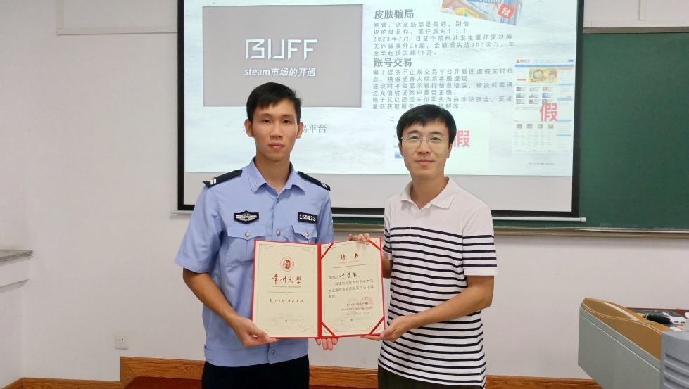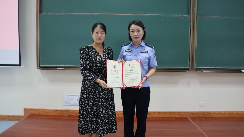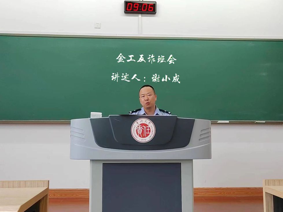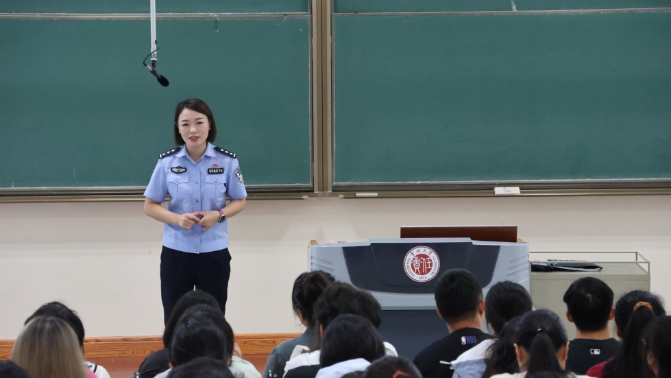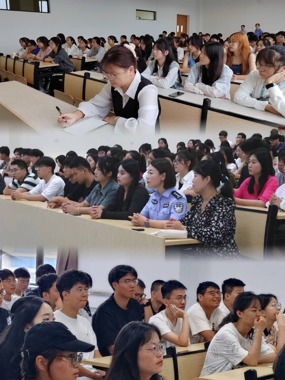 在西太湖校区立德楼举行2023级新生反电信网络诈骗专题讲座。常州市公安局经开区分局二级警长卜雅倩、常州市公安局武警分局嘉泽派出所社区巡防中队副中队长谢小成、常州市公安局刑警支队九大队警官叶子辰受邀指导。我院全体本科、研究生新生参加讲座。