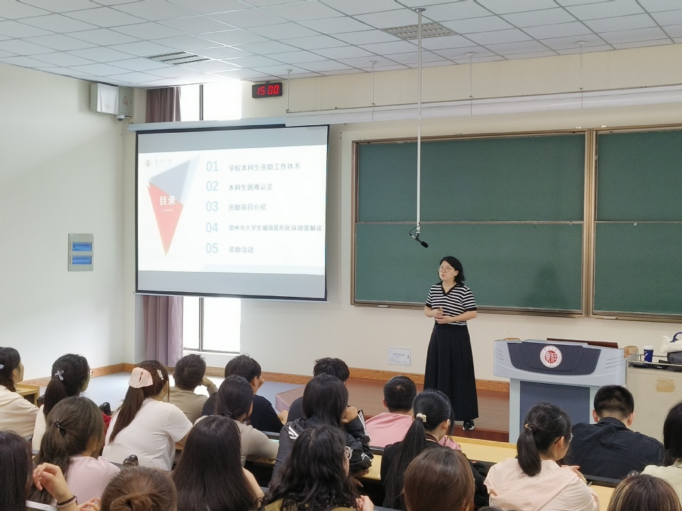 苏扬婧从学校本科生困难认定、本科生资助工作体系、资助活动等方面详细介绍了学校的资助工作,并对常州市大学生城镇居民医保政策解读。她表示,资助育人举措及帮扶实践能够切实帮助家庭经济困难的同学完成学业,同时希望同学们能够认真学习,以所学报效国家、回报社会。(姚宇杰/ 文 顾晗/摄 徐茜/编辑 王彩芳/审核)