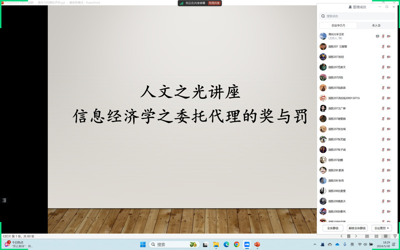 第五场人文之光讲座主讲教师为王欢博士,主题为“信息经济学之委托代理的奖与罚”。讲座通过实例引入,生动展示在经济活动中如何通过机制设计激励代理人,讲座为学生提供了规范委托代理理论的初步介绍。