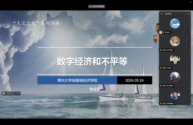 第三场人文之光讲座主讲教师为李成龙博士,主题为“数字经济和不平等”。主要内容包括收入不平等加剧、劳动力市场变化与极化现象、区域不平等、中国劳动力市场就业结构特征等。