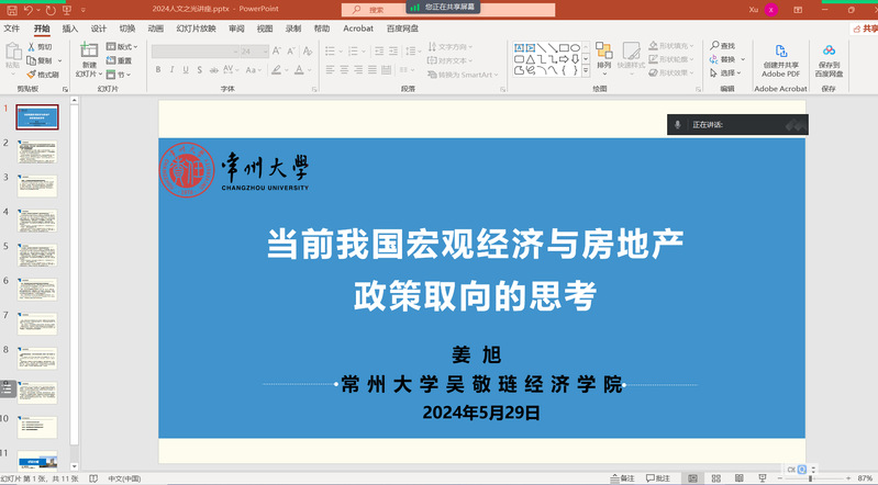 第四场人文之光讲座主讲教师为姜旭博士,主题为“当前我国宏观经济与房地产政策取向的思考”。该讲座通过回顾近日国务院政策例行吹风会的新闻内容,旨在加深同学们对我国房地产与宏观经济情况的了解,培养专业知识运用与思考能力。