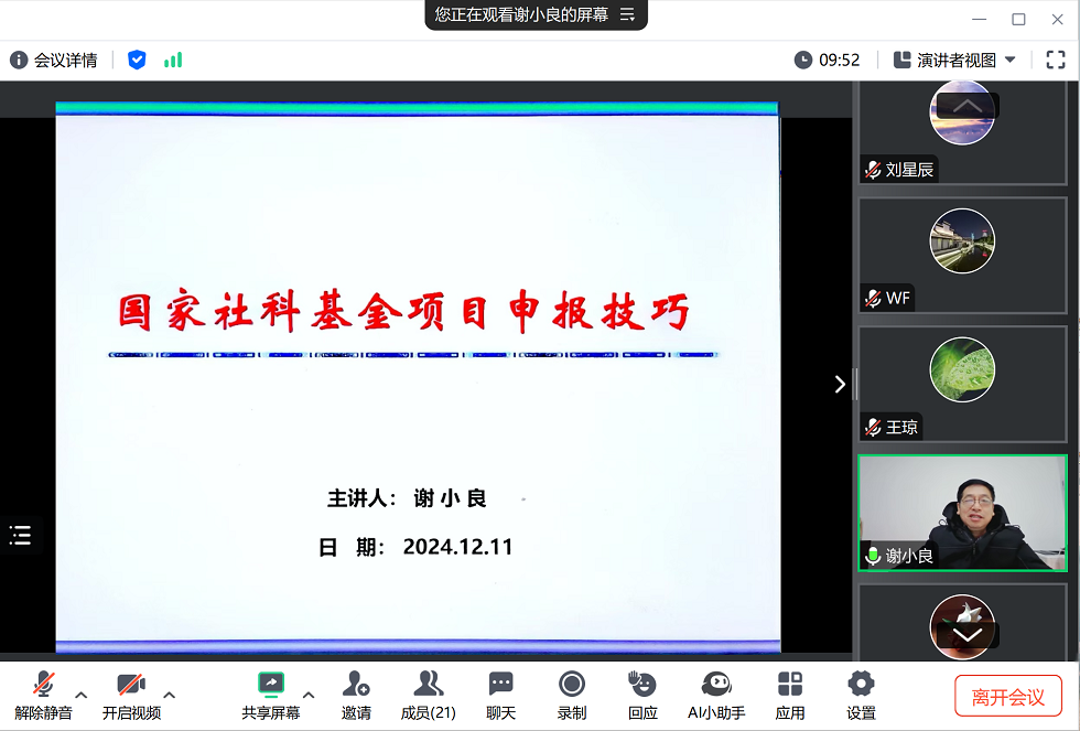 12月12日,ACG盒子 人文社科处和ACG盒子 邀请湖南工商大学数学与统计学院院长谢小良教授作专题讲座,主题为“国家社科基金项目申报技巧”。讲座在腾讯会议线上举行,由ACG盒子 副院长张普主持,ACG盒子 师生参加本次讲座。