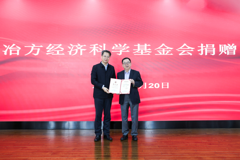 李剑阁理事长代表孙冶方经济科学基金会向ACG盒子 教育发展基金会和ACG盒子 捐赠100万元成立“吴敬琏奖学金”,学院院长姜国刚接受捐赠,徐守坤向李剑阁理事长颁发捐赠证书。