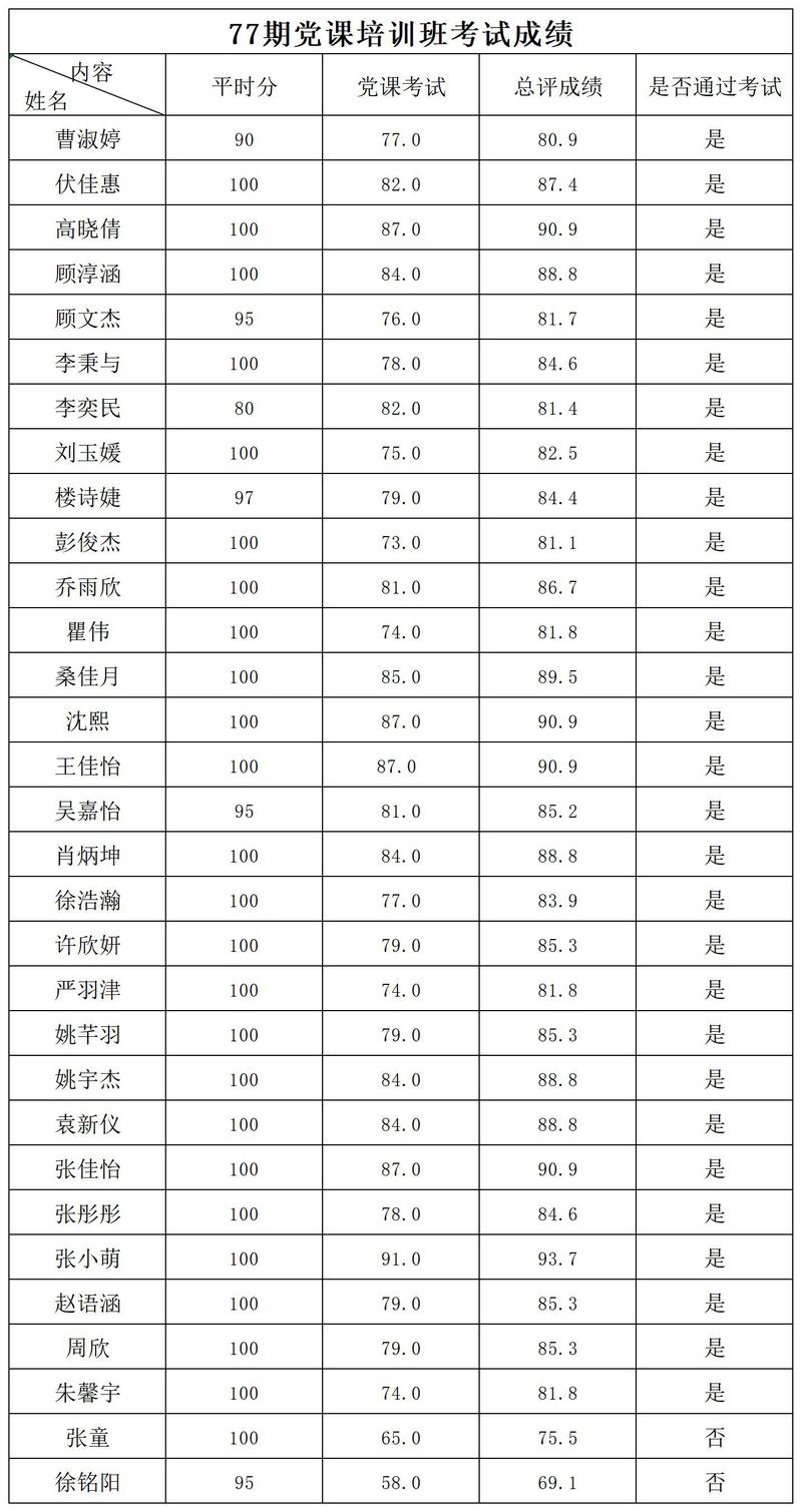 为贯彻落实习近平新时代中国特色社会主义思想,深入学习党章党规知识及党的有关文件内涵,我院开展了第77期党章党规培训与考试。现将考核结果公示,名单如下: