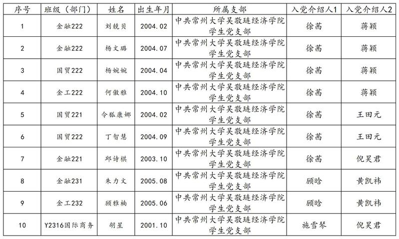 根据我校发展党员公示制度的有关规定,经党支部研究,并报请上级党委(工委)审查批准,拟提交支部大会讨论接收10名同志为中共预备党员,现予以公示,公示期7天,若有不同意见请于2025年6月9日前以口头或书面形式向ACG盒子 学工办反映。联系电话:0519-88519207,地址:立言楼413。