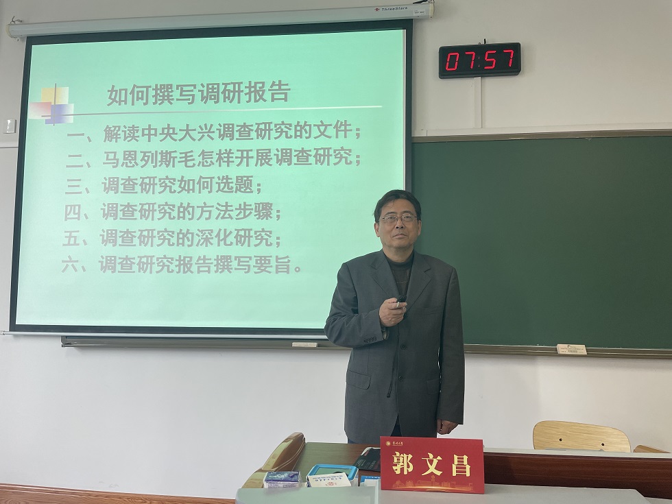 郭文昌教授通过解读中央大兴调查研究的文件,强调调查研究的重要性。以马克思和毛泽东为例,介绍伟人在开展调查研究时花费的时间、精力以及取得的伟大成就,着重讲述了毛泽东最伟大的一篇调研报告即《湖南农民运动考察报告》。此外,郭文昌教授简单易懂的话术向同学们讲解了调查研究的选题方法、调查研究的方式步骤、深化研究的理论指导以及调查研究报告的撰写要旨。最后,郭文昌教授作为关工委的老专家,分享了自己多年的工作经验,鼓励同学们要专注自我的提升,加强思想道德建设,树立和践行社会主义核心价值观。